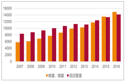 我國(guó)微灌、噴灌、低壓管灌面積(萬(wàn)畝)