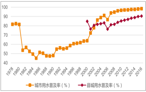我國(guó)城市和現(xiàn)成的供水體系建設(shè)基本完成,用水普及率較高
