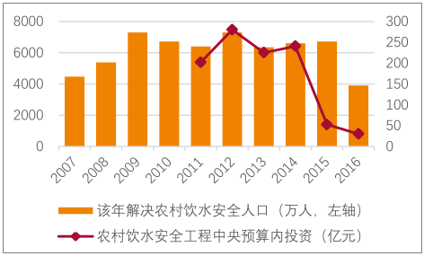 當(dāng)前,農(nóng)村“飲水難”問(wèn)題已經(jīng)基本解決,2015年,農(nóng)村集中供水普及率達(dá)到82.40%;2016年,農(nóng)村自來(lái)水普及率達(dá)到79%,均達(dá)到了較高水平。2015年農(nóng)村飲水安全中的中央預(yù)算內(nèi)投資不足僅52億,較2014年減少190億元,而2016年該投資進(jìn)一步減少至30億。